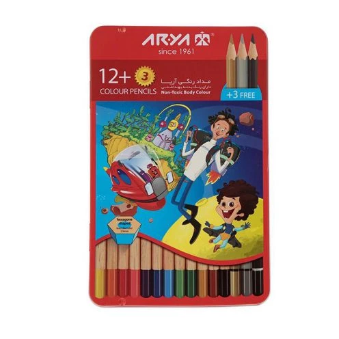 مداد رنگی 12+3 رنگ جعبه فلزی آریا
