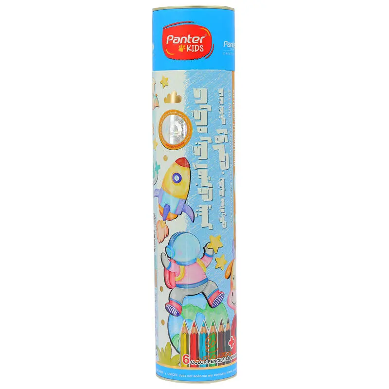 کارگاه رنگ آمیزی پنتر شامل دو کاغذ نقاشی رولی،یک بسته مداد رنگی 6 رنگ،یک تراش،یک پاکن و یک پیکسل است.