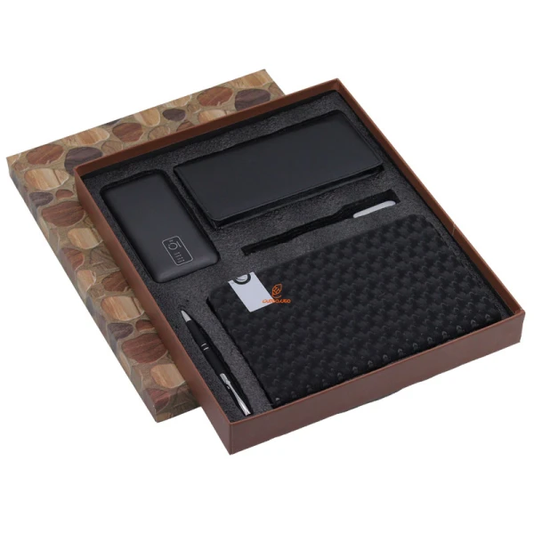 شامل یک عدد پاور بانک، یک عدد خودکار فشاری، یک عدد سالنامه و یک عدد کیف پول پالتویی به همراه یک کابل دو سر USB/MICRO