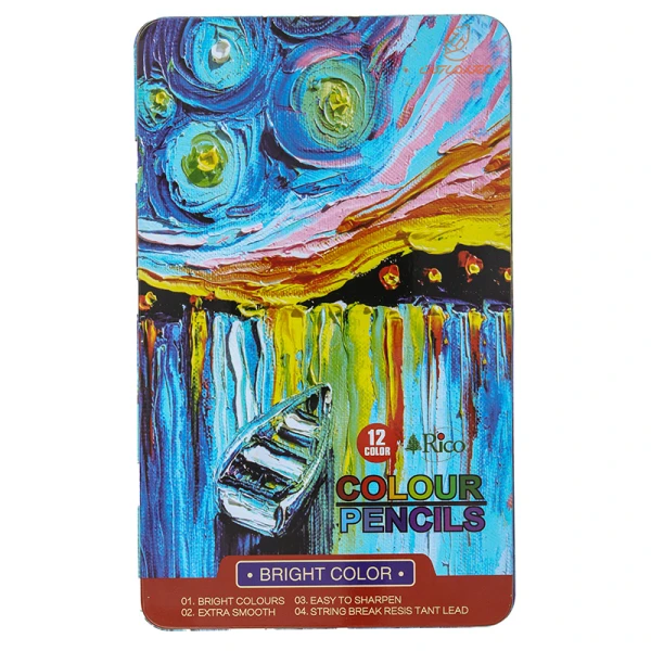 مداد رنگی 12رنگ جعبه فلزی تخت طرح نقاشی آبرنگی ریکو RICO