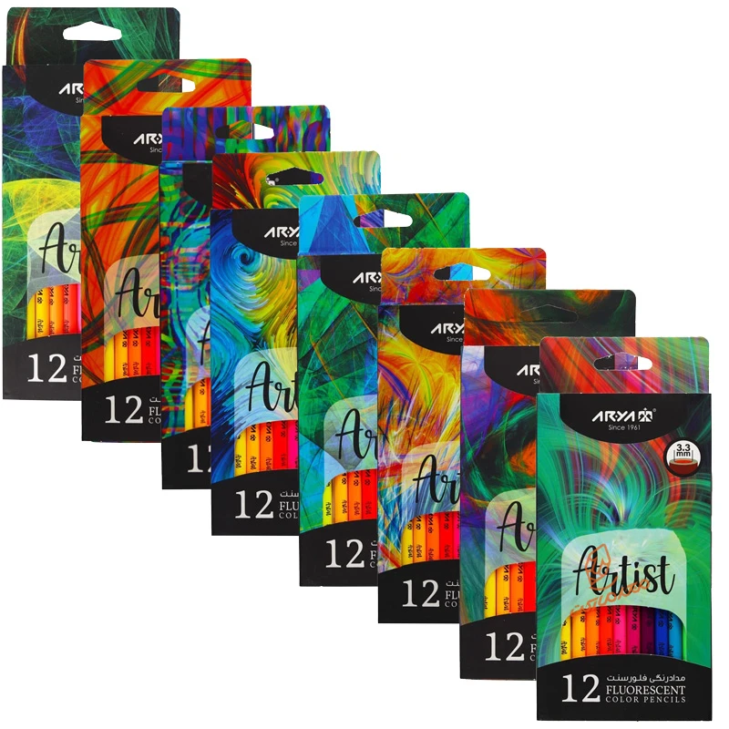طرح روی جعبه به صورت رندوم ارسال می شودمداد رنگی 12 رنگ جعبه مقوایی فلورسنت 108 آریا ARYA